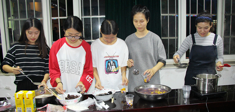 再看这边芋圆制作品尝区前,也已经排起了长长的队伍。在赵丹老师的带领下,烘焙兴趣小组的同学们正现场制作美味的芋圆仙草。凡是今晚参加了猜谜活动的同学,无论猜对几题,都可以前来品尝一碗象征团圆美好的芋圆甜品。正大块朵颐的沈同学说:“芋圆又甜又美味,尤其是与这么多老师学生一起品尝,感觉甜到了心里。”