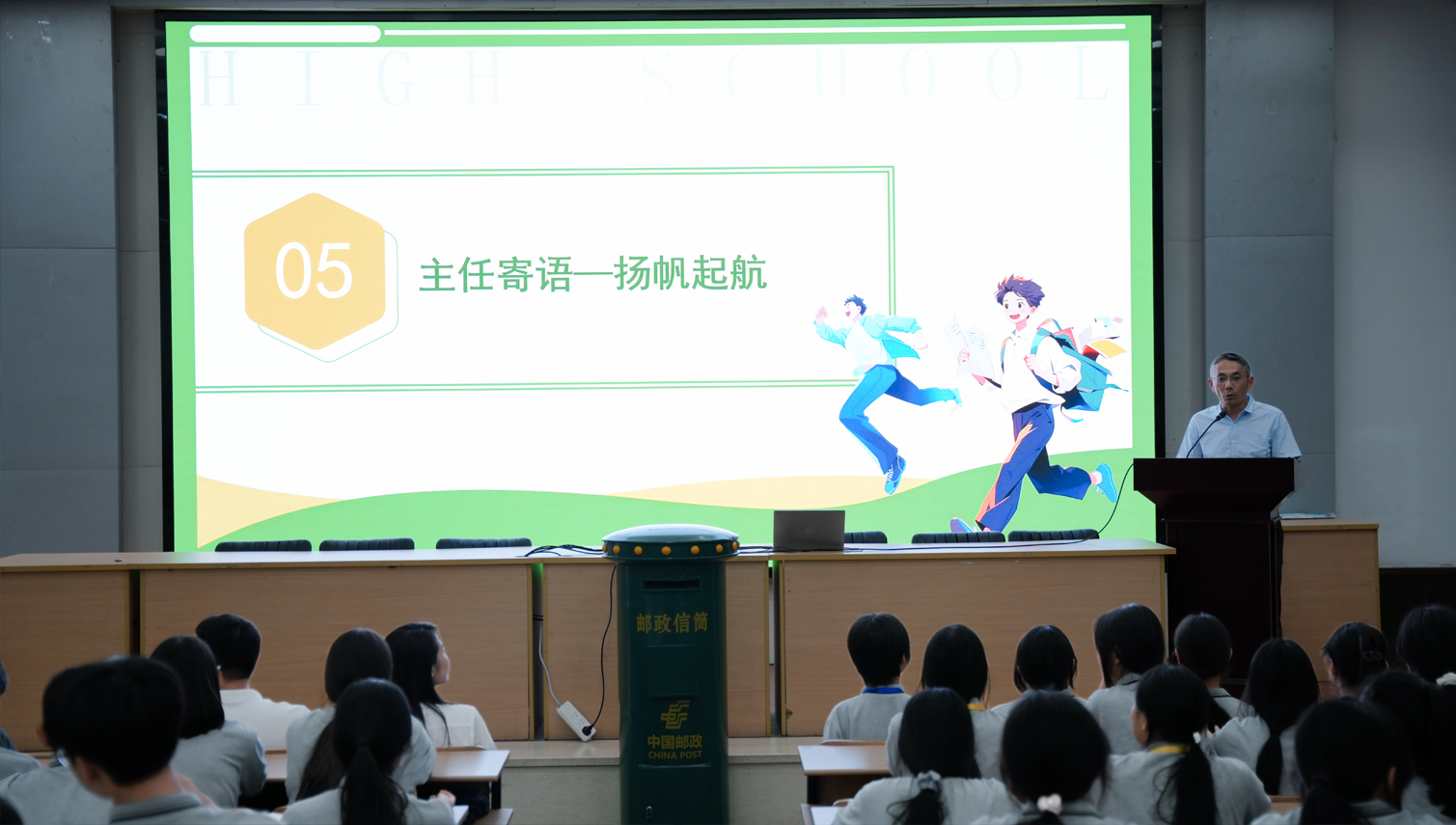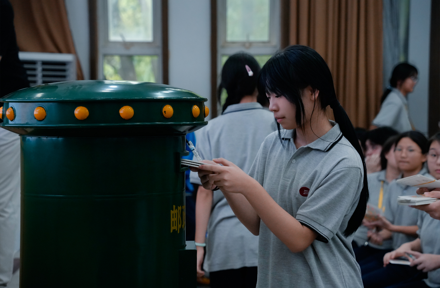 “时光胶囊——寄给未来的自己”环节延续了系部“生涯教育与理想引领”相结合的育人传统,将整场活动推向高潮。秀水邮局局长王艺珊同学先介绍了邮局文化,随后指导全体新生在明信片上认真书写当下的梦想与期盼,再由班级代表有序投入“未来邮筒”。这不仅是一场仪式,更是一次庄严的自我约定,愿三年后,当这封载满年少热望的信笺重回手中,他们能听见自己与梦想共振的回响。