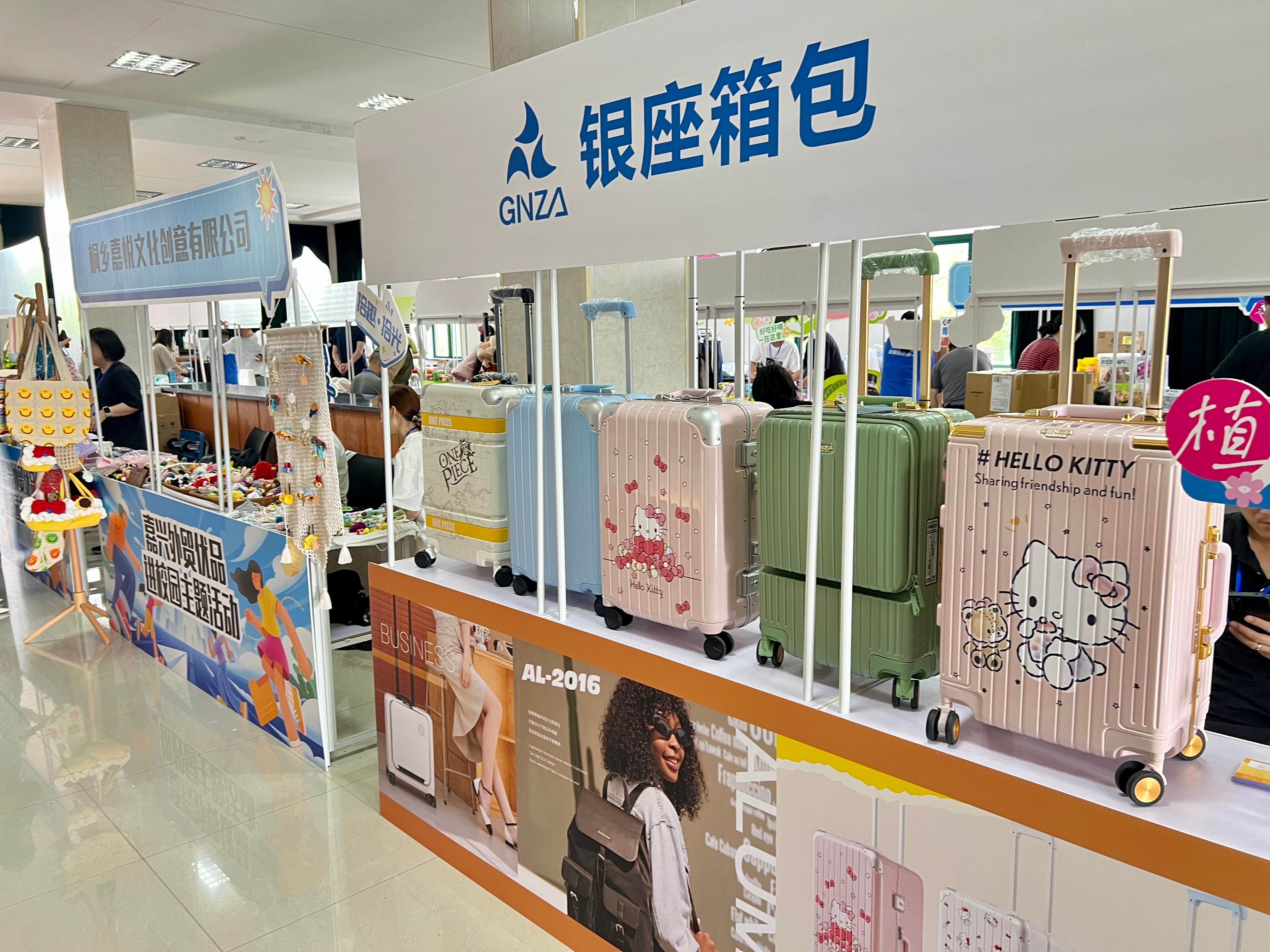 本次活动由嘉兴市商贸局主办,特别邀请了银座箱包、银茂进出口、嘉欣丝绸等19家本地优质外贸企业走进校园。这些企业集中展示了品类繁多的外贸优品,涵盖纺织服装、家居用品、文创产品、休闲食品、体育用品等多个领域,为师生们打造了一场“沉浸式购物体验”。