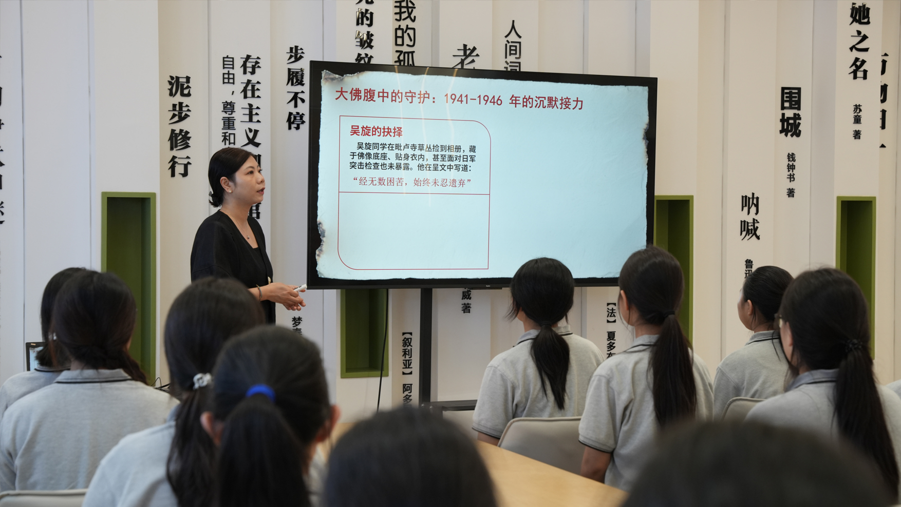 蒋雯从历史叙事自然过渡到现实观照,严厉批判了篡改历史、美化侵略的卑劣行径,并明确指出“历史是未来的避雷针”。接着,她向学生抛出一个发人深省的问题:“倘若当初罗瑾、吴旋选择了沉默与遗忘,今天的我们还能找准未来的方向吗?”在引发学生深思后,她鼓励大家主动化身“底片少年”,以内心的诚实、无畏的勇气和切实的行动,让历史这瓶“显影液”,为现实的前行之路照亮清晰的轨迹。