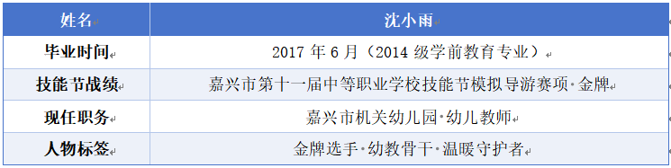 微信公众号同步,点击链接了解更多详情《匠技·正青春③│沈小雨:从模导冠军到幼教星辰,一路生花》https://mp.weixin.qq.com/s/xrqDaz_KQh-nc_5OUamr9Q
