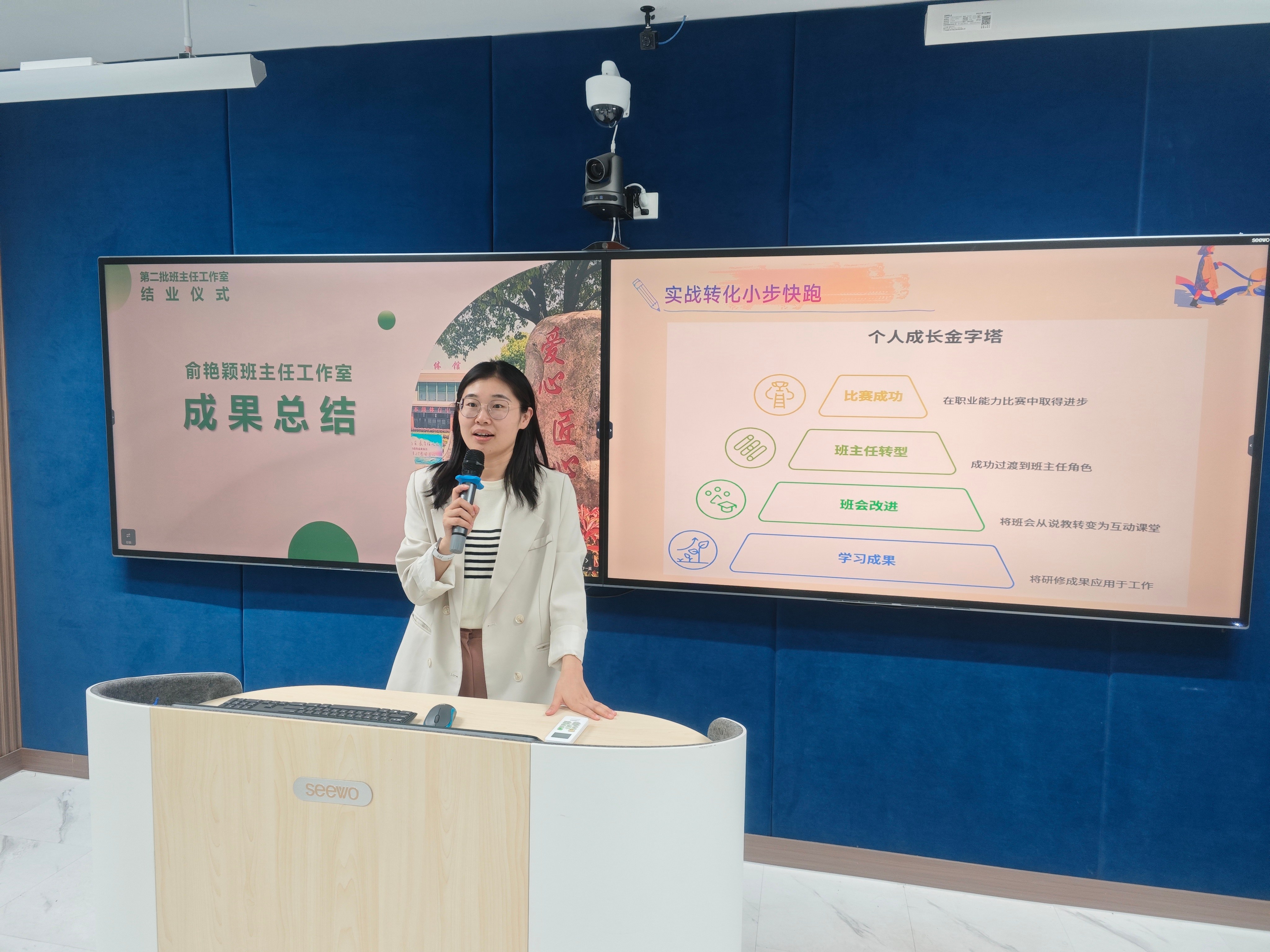 俞艳颖班主任工作室以“提升班级管理能力”为核心,采用“靶向研修+互助实践”双轨模式。在学生成长方面,一是创新互动班会形式,通过情境模拟、小组辩论等方式引导学生主动思考,显著提升了班级凝聚力;二是实践个性化管理技巧,精准关注学生需求,使学生参与班级活动的积极性提高30%。工作室成员在市级班主任基本功大赛、多彩课堂等比赛领域斩获26项荣誉,全面彰显专业实力。