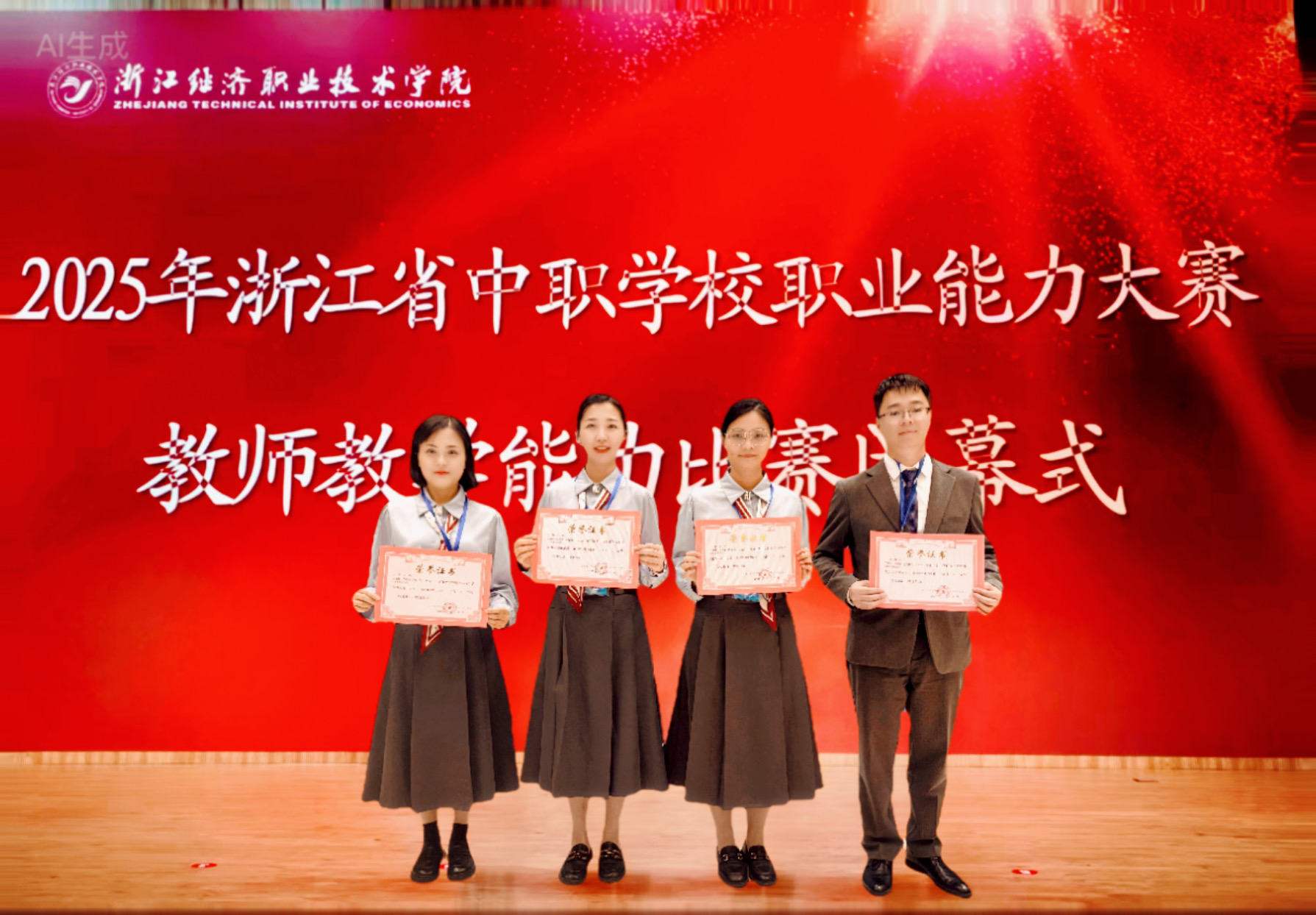 在近日落幕的2025年浙江省中职学校职业能力大赛教师教学能力比赛中,秀水中专计算机专业团队(成员:丁靓、郑婷、沈颖婷、邹伟康)凭借扎实的教学设计、创新的课堂实践和出色的现场表现,荣获省级二等奖,充分展现了学校教师队伍的专业实力。