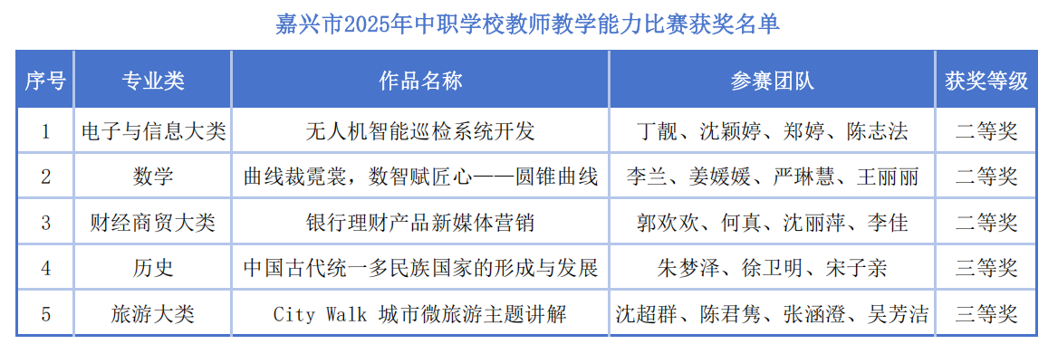 微信公众号同步,点击链接了解更多详情《喜报!秀水中专计算机团队荣获2025年浙江省中职教师教学能力比赛二等奖》https://mp.weixin.qq.com/s/gzlWGeFFRjb5n82dCd3Frw