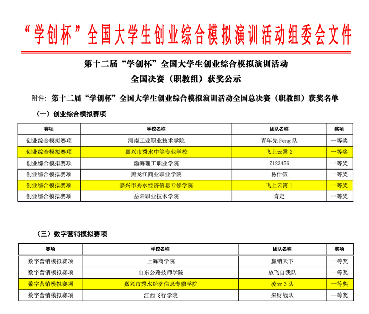 近日,第十二届“学创杯”全国大学生创业综合模拟演训活动全国总决赛(职教组)圆满落幕。经过激烈角逐,秀水中专派出的代表队一举斩获三项全国一等奖!
