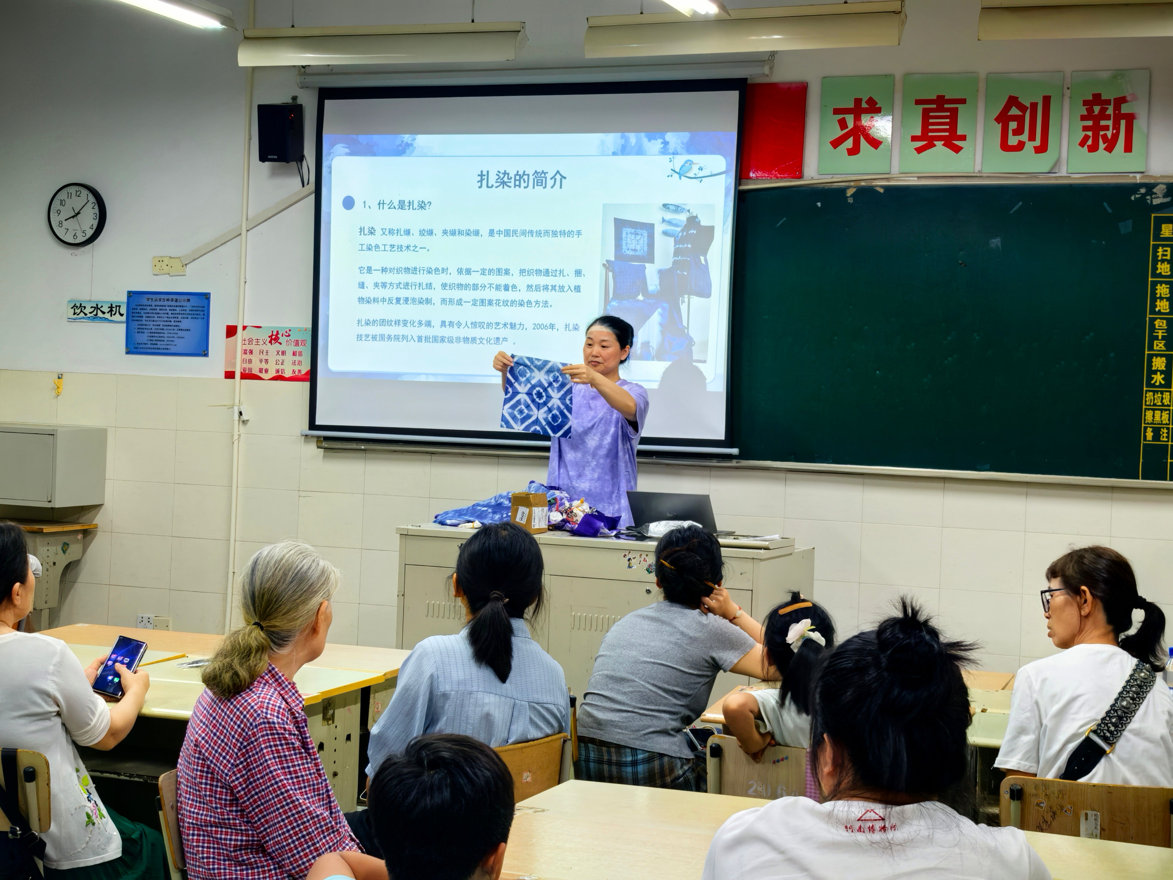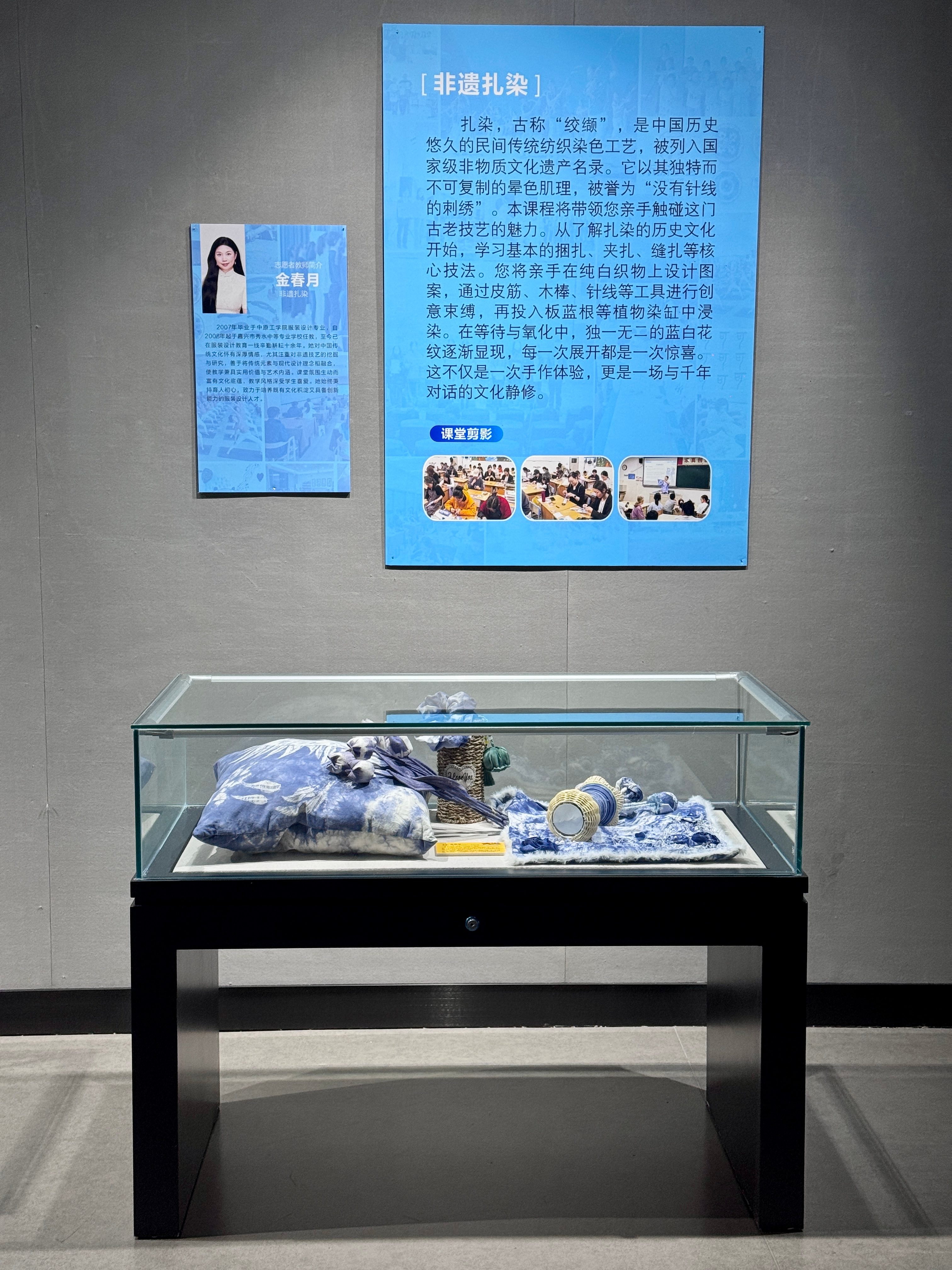 在“非遗扎染”课程中,学员们在教师的带领下,系统学习了扎结技法、染料调配、图案设计等核心技能,还将这门古老艺术融入服装设计和家居装饰中,创作出一批富有特色的作品,展现出了非遗在现代生活中的鲜活生命力。“这种学以致用的实践模式,正是职业教育服务社会的生动体现。”授课教师金春月这样说道。