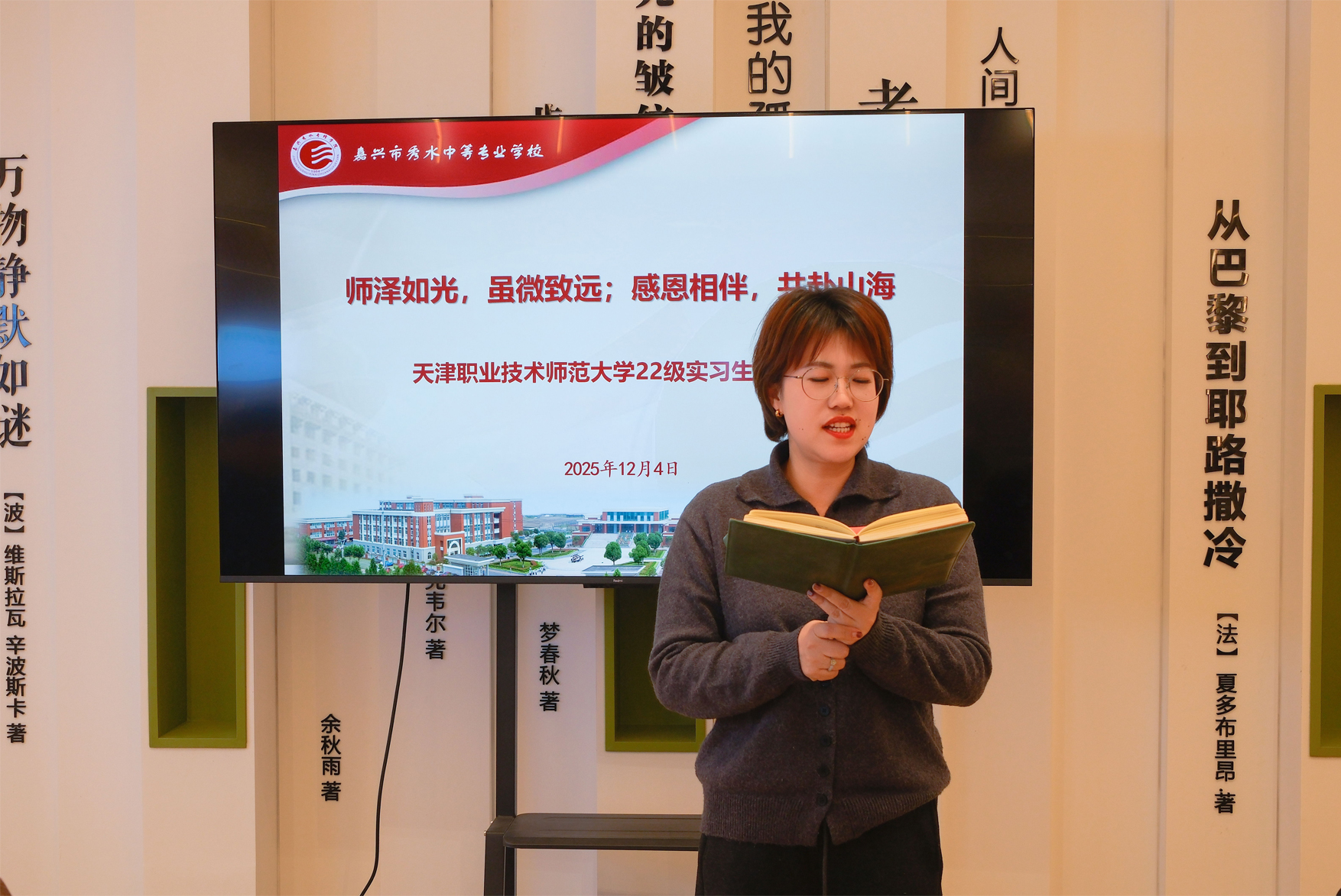 南湖秋色映窗明,师生话别暖意盈。在这叠翠流金的季节里,一场实习欢送会在秀水书屋温情举行,为这段师徒共进的教学实践画上圆满句号。秀水中专副校长蒋雯、系部相关领导及12对结对师徒共同出席,活动由时尚艺术系副主任周毓主持。