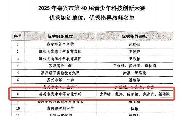 微信公众号同步,点击链接了解更多详情《嘉兴市秀水中等专业学校在2025年嘉兴市第40届青少年科技创新大赛中喜获佳绩》https://mp.weixin.qq.com/s/nwBDAUehn5jvM-Li2M0Xcw