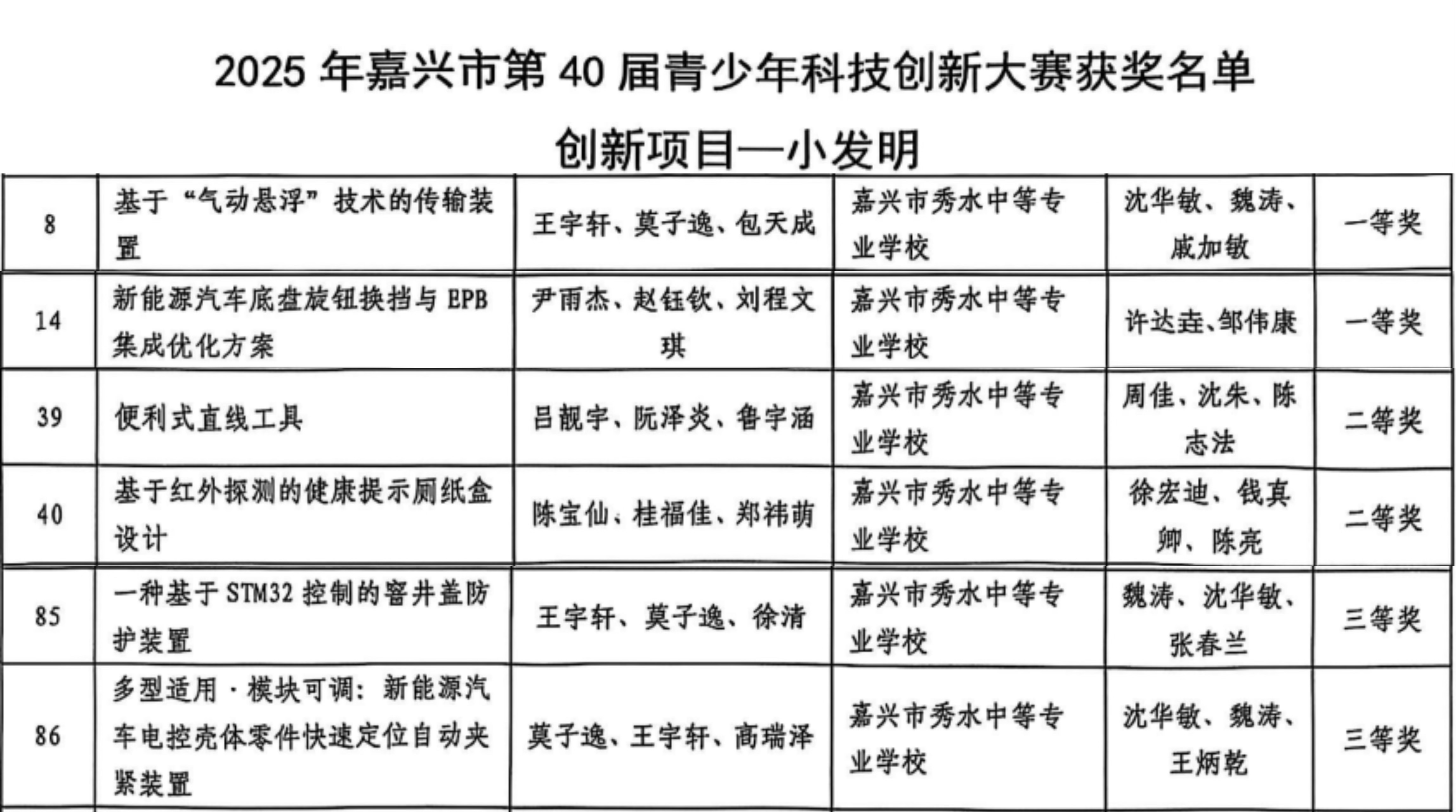 嘉兴市秀水中等专业学校长期重视学生科技创新能力培养,持续构建“以赛促学、以创育人”的教育生态,通过开设科创选修课、建设创客实验室、组建指导教师团队等方式,为学生提供丰富的实践平台,近年来在各类省市级科技赛事中屡获佳绩,彰显出在职业教育与科技创新融合方面的积极探索与丰硕成果。