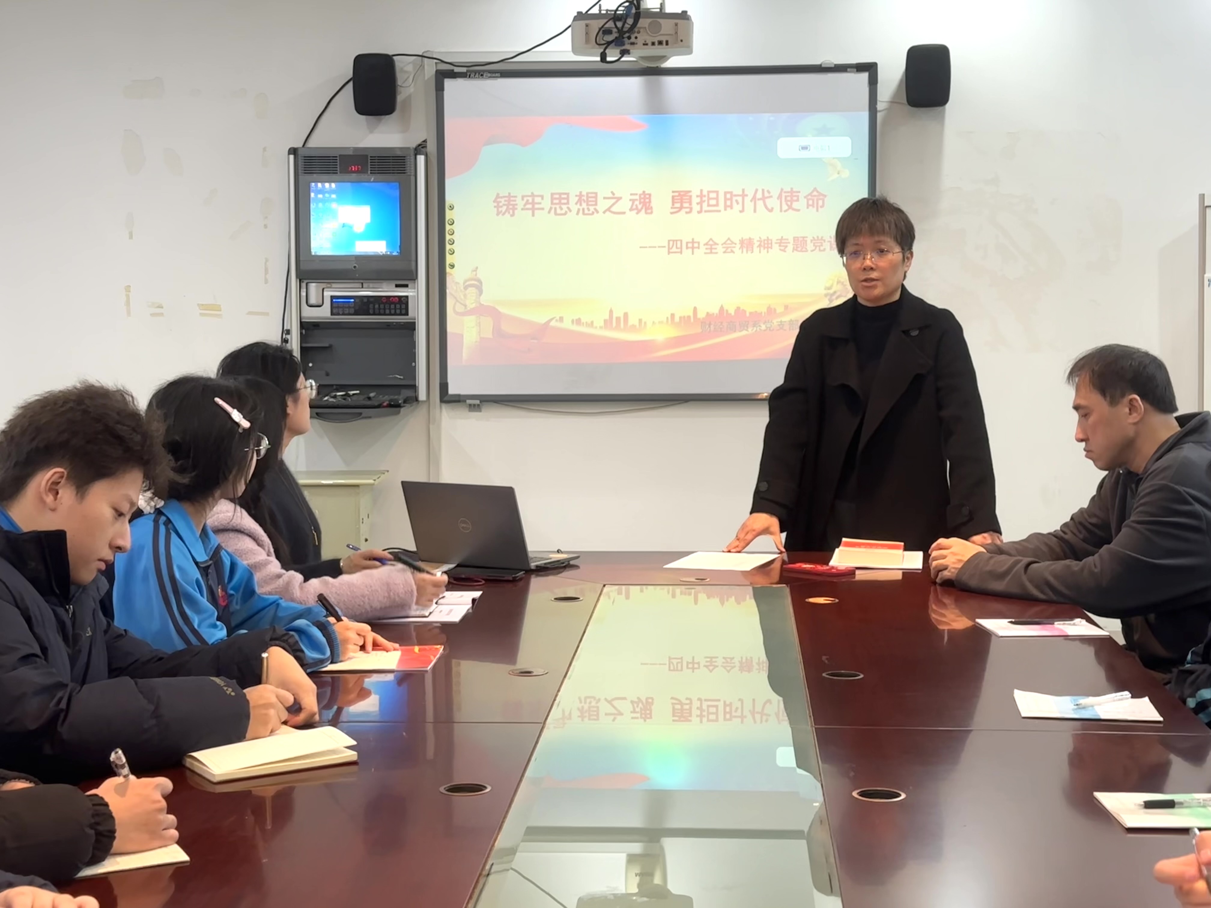 支部书记曹微围绕“铸牢思想之魂 勇担时代使命”主题,讲授了一堂生动的专题党课。课程紧密结合党的二十届四中全会精神核心要义与财经商贸专业发展实际,深入阐释我国制度优势与青年使命的内在联系。曹微指出:“作为未来国家经济领域的建设者,首先要从制度层面读懂中国发展的底气,将制度自信转化为专业自信。大家今后要思考如何立足企业治理、金融市场、国际贸易等领域,以专业才干服务‘中国之治’,贡献财经智慧与商贸力量。”