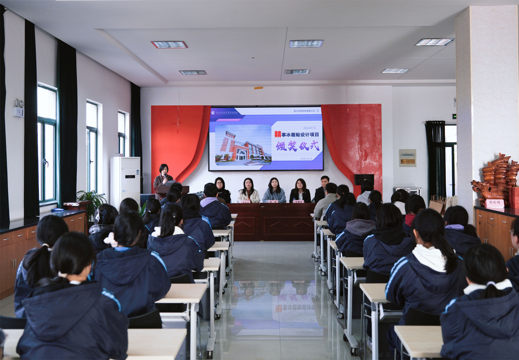 为深化产教融合、提升学生实践能力,嘉兴市秀水中等专业学校与浙江米苋科技有限公司携手推进“喜事冰箱贴”校企合作项目,并于近日举行颁奖典礼。秀水中专副校长蒋雯、柴海燕,校企合作办主任单云峰,米苋科技总经理张龑婷、设计总监郑春明等出席活动。