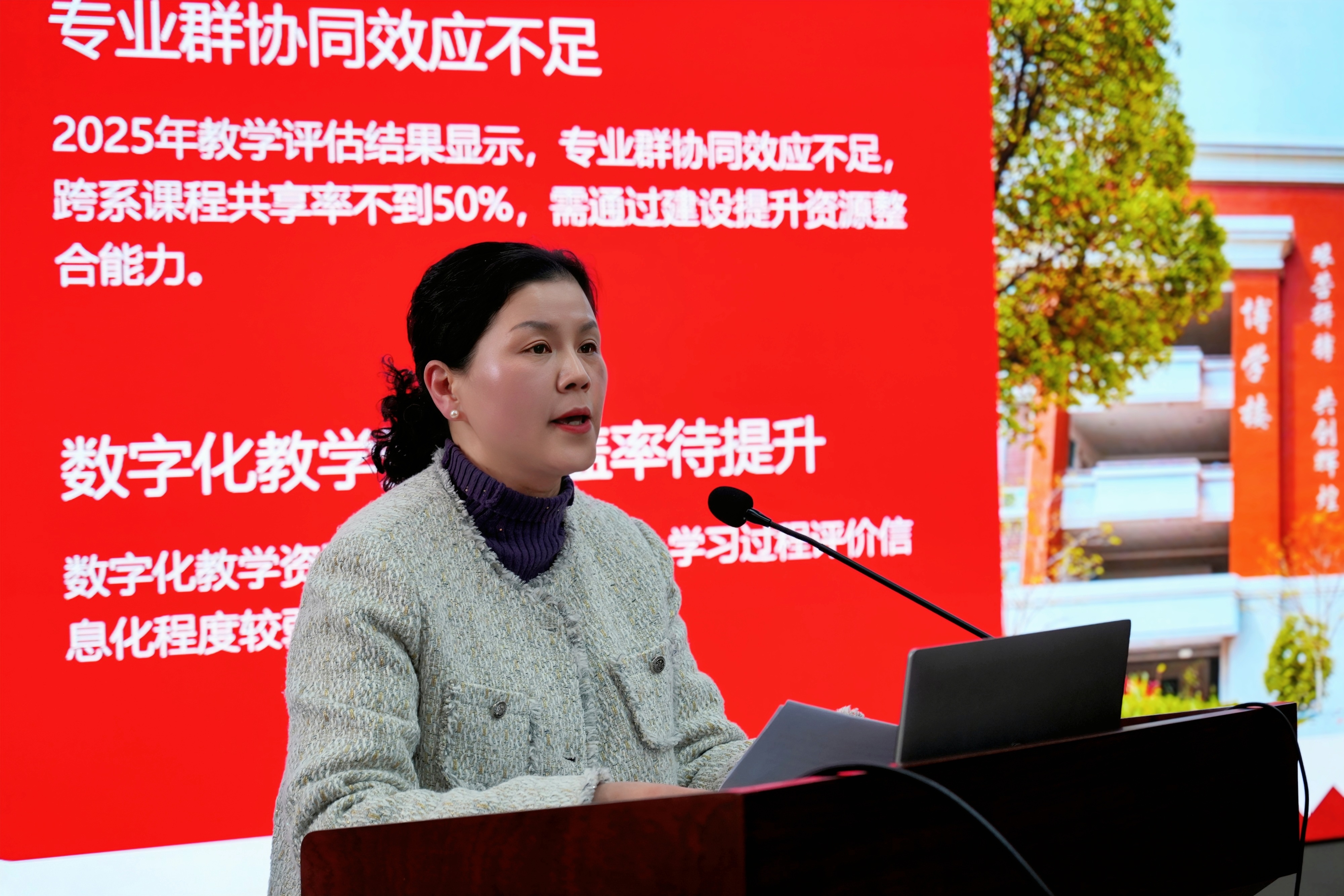 副校长蒋雯部署“十五五”期间学校专业发展思路。她围绕专业群建设核心,提出“专业集群转变、校企协调转变、能力培养转变、智慧教育转变、示范引领转变”五大转变及具体实施路径,明确构建“一标引领、三群协同”的五年梯次目标;同时对标省级“五金”建设标准,从专业、课程、教材、师资、实训基地五个维度,为各部门分层设定任务、提出明确要求,推动专业建设向标准化、高品质方向迈进。
