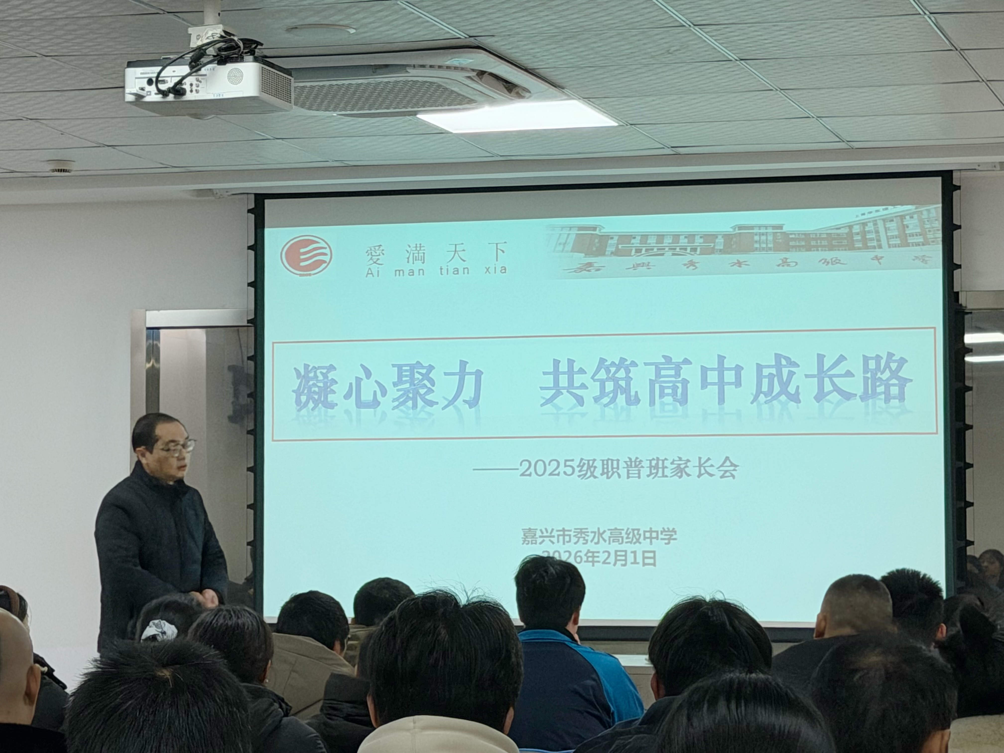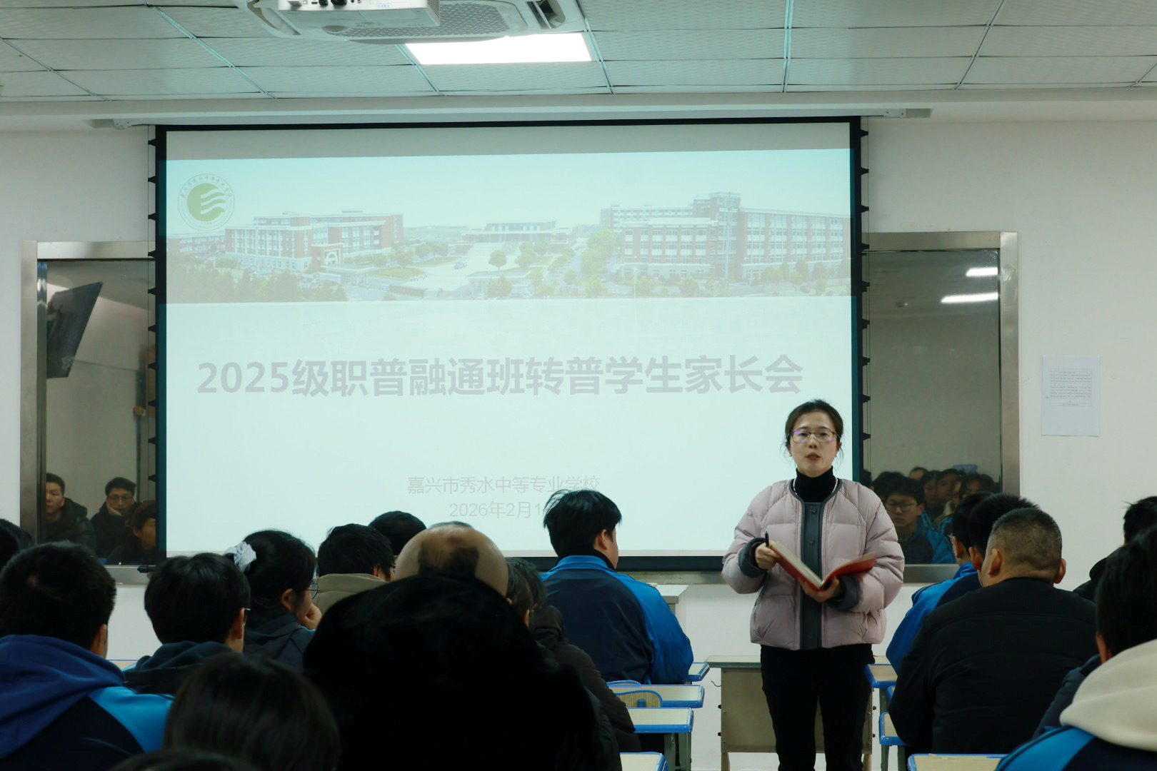 2026年2月1日,嘉兴市秀水高级中学四楼考务会议室座无虚席。这里正在举行一场特殊的家长会——2025级职普融通班转普家长会。30名通过选拔、获得转入普通高中学籍资格的学生及其家长悉数到场。嘉兴市秀水中等专业学校与嘉兴市秀水高级中学的校级领导出席会议。会议由秀水中专高考部主任万冬梅主持。